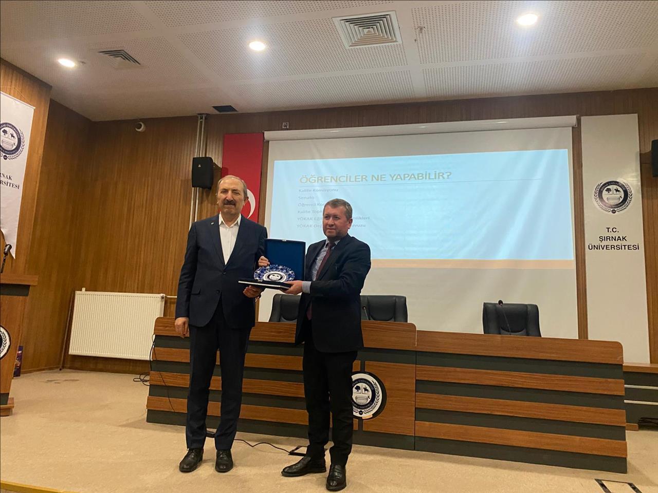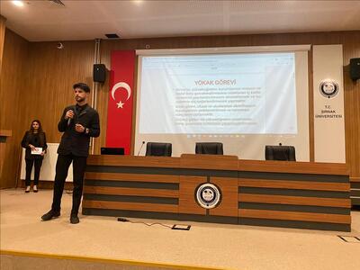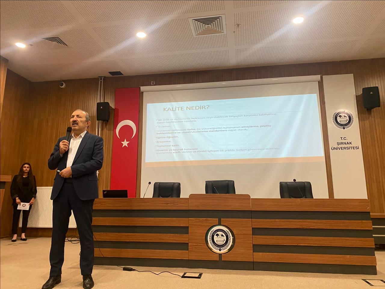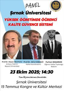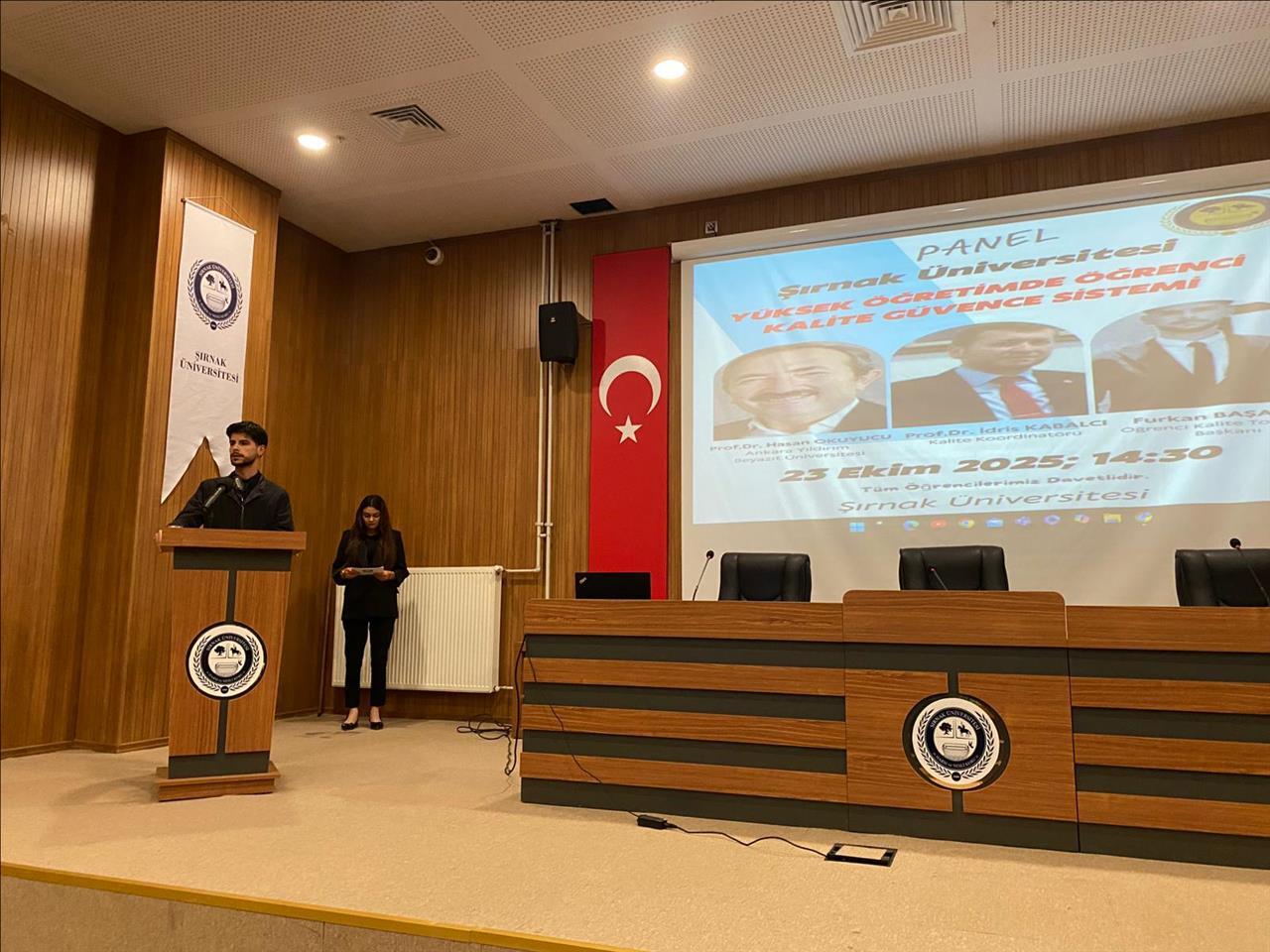 Ankara Yıldırım Beyazıt Üniversitesi Mühendislik Fakültesi Öğretim Üyesi, YÖKAK Dış Değerlendiricisi Prof.Dr. Hasan OKUYUCU "Yüksek Öğretimde Öğrenci Kalite Güvencesi Sistemi" başlıklı sunumu yaptı. Kalite Komisyonu Başkanlığı, Koordinatörlüğü ve Öğrenci Kalite Topluluğu olarak Panel kapsamında yapılacak sunuma tüm öğrencilerimiz, Kalite Komisyonu üyeleri, Çalışma Grupları, Kalite Elçileri ile tüm Öğretim üyelerimiz teşrif etmişlerdir. Sunum kapsamında, Öğrenci Kalite Topluluğu başkan Yrd. Furkan BAŞARAN öğrencilere yönelik Kalite Güvencesi ile ilgili süreçler hakkında bilgi verdi.